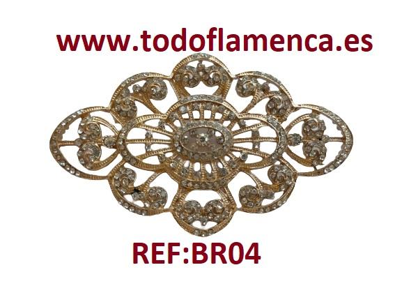 Broche de mantilla española dorado con brillos incrustados, el complemento ideal para lucir con tu mantilla, o con tu vestido de fiesta.Medidas: 9 x 5 cm.