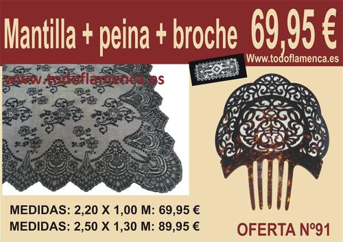Todo este lote de mantilla española negra , peineta de plástico de color concha y broche plateado cuesta 75€ y 95€, según la medida de la mantilla.