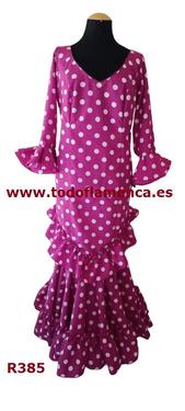 Oferta traje de flamenca bugambilia con lunares blancos, con manga al codo, Nueva Colección, muy económico, con una excelente calidad-precio. Tela de strech, muy ligera. Traje de flamenca barato.