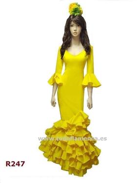 Oferta traje de flamenca amarillo, con manga al codo con un volante, Nueva Colección, muy económico, con una excelente calidad-precio. Tela de strech, muy ligera. Traje de flamenca barato.