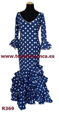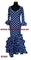 Oferta traje de flamenca azulino con lunares blancos, con manga al codo con un volante, Nueva Colección, muy económico, con una excelente calidad-precio. Tela de strech, muy ligera. Traje de flamenca barato.