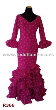 Oferta traje de flamenca bugambilia con lunares fucsia, con manga al codo con un volante, Nueva Colección, muy económico, con una excelente calidad-precio. Tela de strech, muy ligera. Traje de flamenca barato.