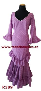 Oferta traje de flamenca malva con lunares blancos, con manga al codo con un volante, Nueva Colección, muy económico, con una excelente calidad-precio. Tela de strech, muy ligera. Traje de flamenca barato.