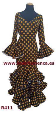 Oferta traje de flamenca negro con lunares amarillos, con manga al codo con un volante, Nueva Colección, muy económico, con una excelente calidad-precio. Tela de strech, muy ligera. Traje de flamenca barato.