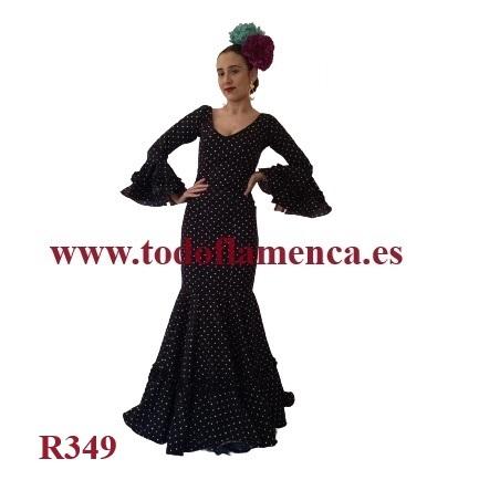 Oferta traje de flamenca negro con lunar blanco, con un volante en la manga, Nueva Colección, muy económico, con una excelente calidad-precio. Tela de estrech, muy ligera. Traje de flamenca barato.