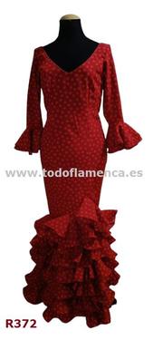 Oferta traje de flamenca rojo con lunares color coral, con manga al codo con un volante, Nueva Colección, muy económico, con una excelente calidad-precio. Tela de strech, muy ligera. Traje de flamenca barato.