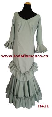 Oferta traje de flamenca verde empolvado, con manga al codo con un volante, Nueva Colección, muy económico, con una excelente calidad-precio. Tela de strech, muy ligera. Traje de flamenca barato.