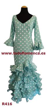 Oferta traje de flamenca verde agua claro con lunares blancos, con manga al codo con un volante, Nueva Colección, muy económico, con una excelente calidad-precio. Tela de strech, muy ligera. Traje de flamenca barato.